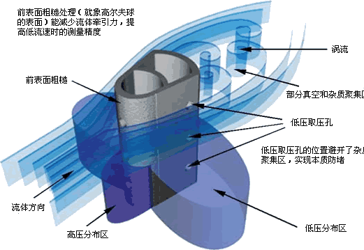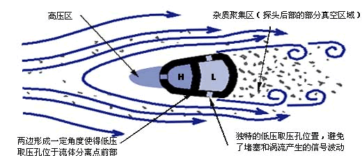 探頭的前部形成高壓區(qū),壓力略高于管道靜壓,阻止了顆粒進(jìn)入。請(qǐng)注意:在探頭的高壓取壓孔處流體的速度是零,沒有物體會(huì)進(jìn)入取壓孔。